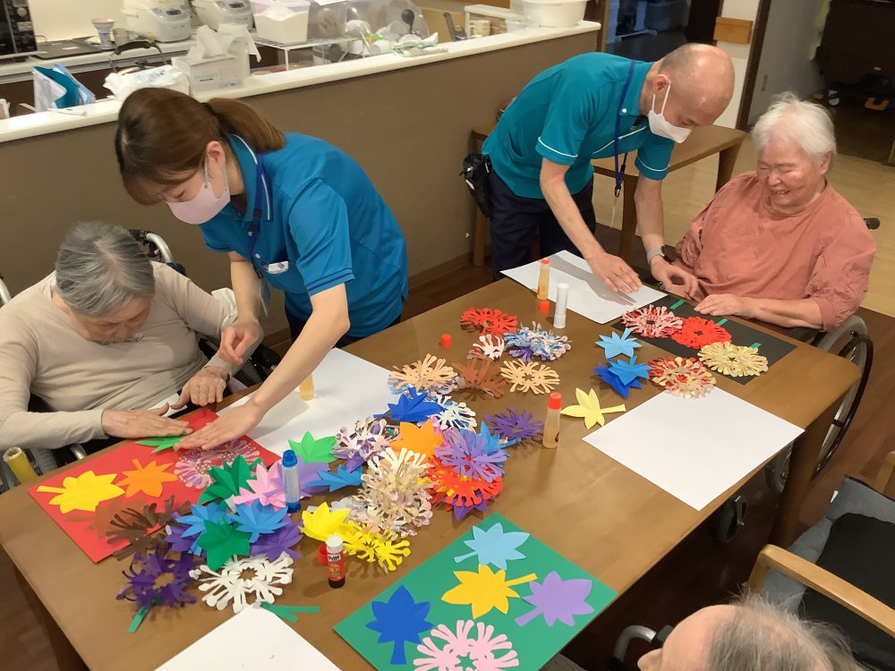 今月は折り紙で作った彼岸花と紅葉を色画用紙に貼り名前を書く企画です。