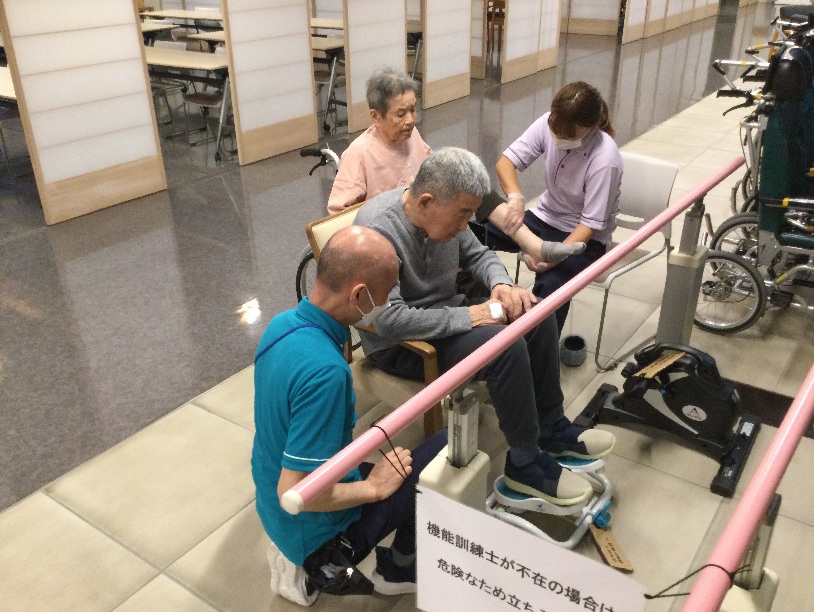 今回は、施設で足踏み器を使った下肢運動の様子をご紹介します。
